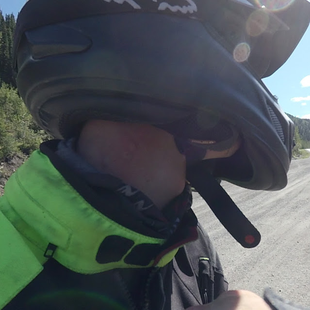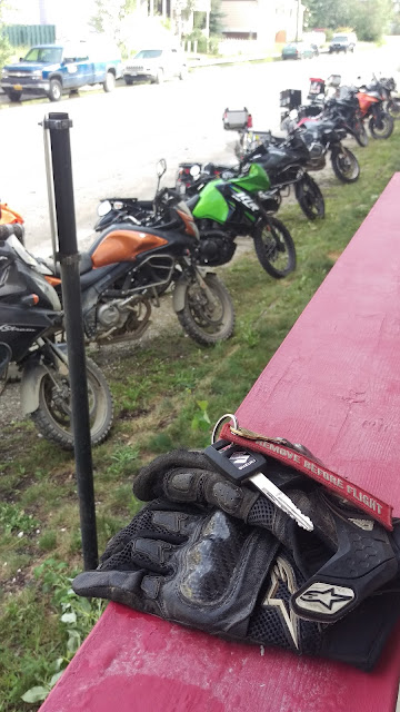 The riding the next day was mostly dry with only a short shower or two. We had been backtracking up until Watson Lake, but now we were on new road. The Alaska Highway, instead of the Cassiar we had taken on our way north, There were many prominent signs warning of bison on the road. We heeded the warning, but were not prepared for the sheer number of free roaming bison we ended up seeing. Unfortunately my Cardo Scalarider Q3 had decided to stop charging so once that died we were limited to brake light flashing and pointing to indicate bison. I've since ordered a new shiny set of Sena units. At times, we rode through the middle of herds of bison lining the road. We were reminded of our friend from Dawson, Enrique, who told us about the bison on the road and how he chased one on his r1200gs until it stopped and stared him down at which point he decided to leave it alone.
