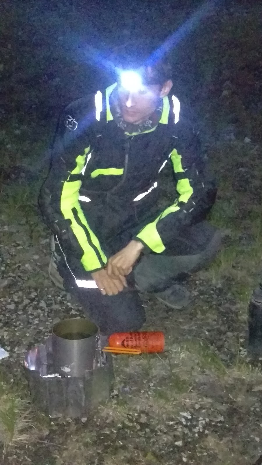 When we made it to Liard Hotsprings provincial campground we were dismayed to find the campground full and the "overflow" campground to be an uninspiring gravel parking lot across the highway. Despite this, the price for camping in overflow was still $26 - no cheaper than camping in the real campground. We decided to press on further south. The bikes needed fuel but nothing was open. We passed campground after campground - all full. We did see a caribou at one point, which was neat. We made it to the southern tip of Muncho lake where we found a closed gas station/motel. There were people inside the small diner so dad tapped on the window and was greeted by a provincial park operator. She told us we were free to camp anywhere outside the provincial park - or she could sell us a camping permit for $20 to camp at Macdonald Campsite on Muncho lake. Foolishly we decided to make for the edge of the provincial park and try our luck with roadside camping. We'd barely set off again when I realized from the GPS that the edge of the park was a bit further than comfortable with the amount of fuel we had left. We turned back and tracked down our park operator again. I imagine she was a bit annoyed, but she sold us a camping permit and directed us back north a few kms to get back to MacDonald campsite. It was dark by the time we arrived. Finally after being in the land of the midnight sun, we got to use the headlamps we'd packed all the way from Calgary to set up our tent and campstove for a dinner of Kraft Dinner Mac n' Cheese,